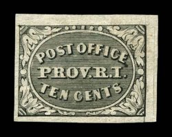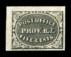 1002 og 10X1 image#10X1, Providence, R.I., 5c Gray black Postmaster Provisional, gem mint example, being a top left corner sheet margin single (position 1 from the sheet of twelve), featuring large to huge margins all around, extraordinarily fresh, crisp impression, full clean o.g., lightly hinged, extremely fine; 1999 PF certificate. (Image) $350.00