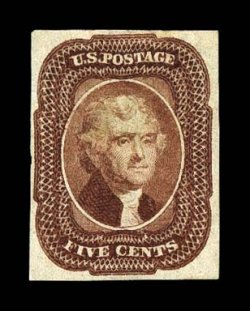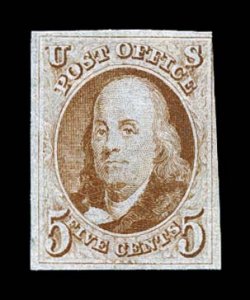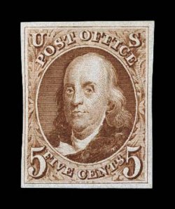1009 og 12 image#12, 5c Red brown, an incredibly rare and choice mint example, being one of just a few known examples which still retains its original gum, featuring large margins all around that are well clear of the design projections, sumptuously rich color and a deeply etched impression on bright paper, full original gum which has been relatively lightly hinged, tiny insignificant corner crease at top right well clear of design, still extremely fine; a key mint classic rarity of the United States; 1998 PSE certificate. (Image) $20,000.00