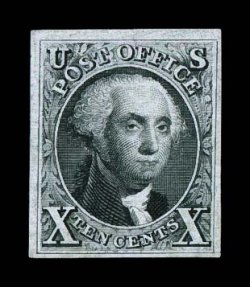 1005 ng 2 image#2, 10c Black, an extremely rare unused example, possessing the finest appearance for any unused or mint example we have ever offered, boasting an incredible overall freshness which belies its age, outstanding prooflike impression and color on well blued paper, extraordinarily margined as well, with large to huge margins all around, trace of original gum which has been slight redistributed, barest perceptible trace of a vertical crease at right in no way detracting from this stamp's extraordinary appearance, otherwise extremely fine; 2003 PF certificate. (Image) $12,500.00