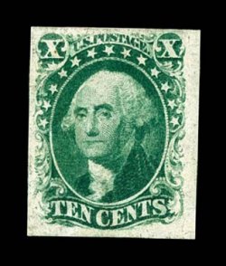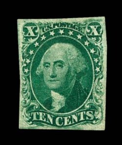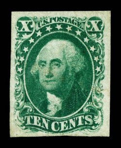 1010 og 13 image#13, 10c Green, Ty. I, a marvelous example of this immensely rare mint stamp, possessing exceptional physical attributes lacking on most of the surviving unused or mint examples, including four large and well balanced margins, gorgeous rich color and an extraordinarily detailed impression on bright paper, and equally impressive is the fact that this stamp still retails a large portion of its original gum (among the very few thus), extremely fine; while this auction firm has had the privilege of selling some of the most significant collections of United States stamps to have come on the auction market in the last decade, virtually none had a mint copy of Scott #13, let alone in this premium original gum condition; in our opinion, this is one of the finest of the minute number of mint examples of the 1855 Ten Cent Type I in existence; 2001 PF certificate. (Image) $16,000.00