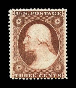 1019 og 25 image#25, 3c Rose, Ty. I, a highly desirable mint example of this notoriously difficult stamp, possessing an overall freshness and brilliance that is seldom seen on the vast majority of mint copies, with sumptuously rich color and a well defined impression on wonderfully bright paper, but even more impressive is this stamp's essentially perfect centering, which is a virtually unheard of trait on this typically notoriously poorly centered and tightly spaced stamp, pristine full o.g. which has been only lightly hinged, an extremely fine gem; easily among the finest original gum examples of Scott #25 in existence; 1998 PF certificate. (Image) $3,000.00