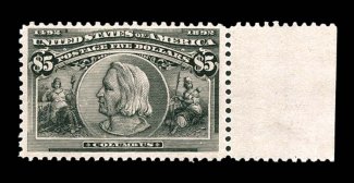 1181 nh 245 image#245, $5.00 Columbian, an extraordinary right sheet-margin mint example that is among the few Five Dollar Columbians that has been certified as never hinged by the Philatelic Foundation, crisp prooflike color and impression, well centered within large margins, pristine o.g., never hinged, very fine; a stamp that is remarkable not only for its never hinged status, but for its impressive overall freshness as well; photocopy of a 2000 PF certificate for a block of four, this being the top right stamp. (Image) $9,000.00