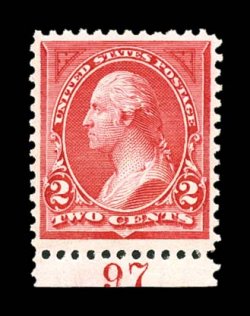 1184 nh 250 image#250, 2c Carmine, Ty. I, a top sheet-margin partial imprint single that is the epitome of perfection, flawlessly centered amid immense margins seldom associated with any of the Bureau issues, stunning color that is absolutely radiant on bright fresh paper, unblemished o.g., n.h., extremely fine; a superb gem certain to realize impressive multiples of its relatively modest catalog value; 2000 PF certificate for an imprint and plate number strip of three, this being the left stamp. (Image) $77.50