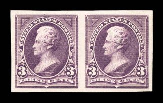 1193 og 268a image#268a, 3c Purple imperforate, horizontal pair, four large and well balanced margins, quite fresh, o.g., lightly hinged, extremely fine. (Image) $275.00