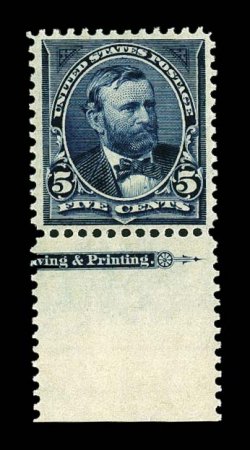 1200 nh 281 image#281, 5c Dark blue, bottom sheet-margin partial imprint single, precisely centered, rich luxuriant color and a crisp impression on bright paper, o.g., n.h., extremely fine; 1997 PF certificate. (Image) $87.50