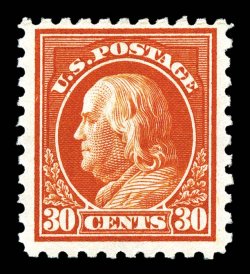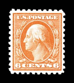 1308 nh 476A image#476A, 30c Orange red, the extremely rare unwatermarked, perforated 10 issue, an exceptionally fresh and desirable mint example of this notoriously difficult and elusive stamp, possessing a marvelous overall freshness, with rich luxuriant color and a clean crisp impression on bright paper, while centered just a bit to top, this is actually far better centered and margined than the vast majority of the small existing population (most are strongly off center, often well into the design), pristine o.g., never hinged, very fine and exceedingly choice; one of the rarest U.S. stamps of the 20th century, with only two sheets recorded (200 stamps total), this being position 19 from the plate no. 6911 sheet; 1984 PF certificate. (Image) for fine $5,750.00