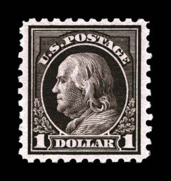 1310 nh 478 image#478, $1.00 Violet black, a brilliant "post office" fresh never hinged example of this rare high value, possessing an overall freshness not often encountered, with gloriously rich color and a razor-sharp impression on immaculate paper, extraordinarily well centered as well, pristine o.g., n.h., extremely fine; a stamp that is almost never offered both in choice quality and never hinged; 1997 PSE certificate (sheet selvage subsequently removed); ex-Vreeland. (Image) $1,800.00