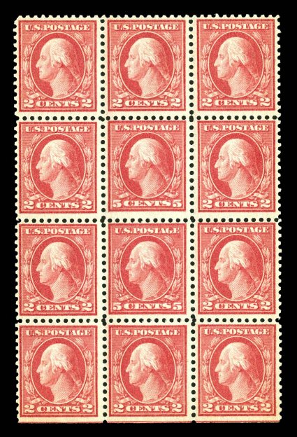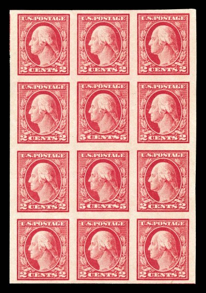 1313 og/nhbl 485 image#485, 5c Carmine error imperforate double error in a extraordinary quality block of twelve, boasting lavishly large and wonderfully balanced margins all around, marvelously fresh overall, with gloriously rich color, o.g., two corner stamps at top hinged, rest in block never hinged including the two key error stamps, top left stamp with barely detectable and insignificant thin spot, extremely fine.It has been recorded by George B. Sloane that a total of 48 uncut imperforate sheets of 400 of plate no. 7942 were sold out of the New York City Post Office, each sheet containing a single error and a double error, making 48 the maximum number of either error block and certainly less than that number are available today.A showpiece example of this important and popular error rarity. (Image) $42,500.00