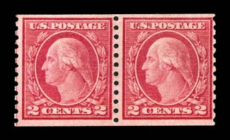 1314 og 491 image#491, 2c Carmine coil, Ty. II, perf. 10 vert., an attractive mint pair of this sought-after coil rarity, bright rich color and a crisp impression, nicely centered, o.g., relatively lightly hinged, nearly very fine; 1959 PF certificate. (Image) $5,250.00