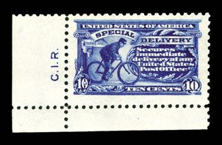 1341 nh E9 image#E9, 10c Ultramarine, an eye-arresting bottom left corner sheet-margin single with "C.I.R." initials, featuring gignatic margins and being wonderfully well centered within them, gloriously rich color and a sharp impression on bright paper, o.g., n.h., extremely fine; a remarkable stamp; 1999 PF certificate. (Image) $400.00