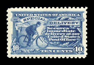 1342 nh E10 image#E10, 10c Pale ultramarine, an extraordinary mint single, featuring absolutely perfect centering amid extravagantly large margins, strong color and impression, unusually even and intact perforations all around, o.g., n.h., minor vertical bend not mentioned on accompanying certificate, extremely fine; clear 1992 PF certificate. (Image) $600.00