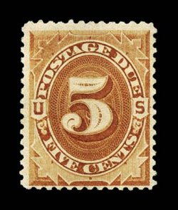 1352 nh J18 image#J18, 5c Red brown, brilliantly fresh mint example, lovely rich color and a razor-sharp impression, well centered within large margins, o.g., n.h., choice very fine; a terribly difficult postage due to find never hinged. (Image) for hinged $600.00