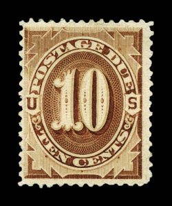 1353 nh J19 image#J19, 10c Red brown, virtually perfectly centered amid large margins, sumptuously rich color and impression, pristine o.g., n.h., extremely fine; an exceptionally scarce and desirable stamp in this gem never hinged condition; a true condition rarity; 1994 PSE certificate; ex-Floyd. (Image) for hinged $600.00
