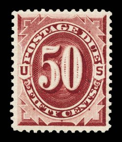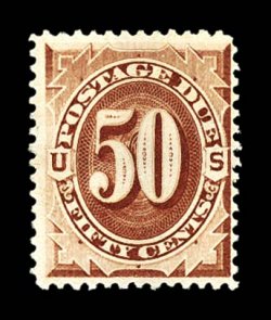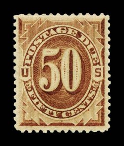 1348 nh J7 image#J7, 50c Brown, a magnificent quality mint example, being in a true "post office" fresh state, gloriously rich color and a crisp prooflike impression on bright paper, wonderfully well centered within uncharacteristically large margins, unblemished full o.g., n.h., extremely fine gem; the only premium quality never hinged example of the 1879 Fifty Cent Postage Due we have ever offered in our auctions; 1990 and 2004 PF certificates. (Image) for hinged $600.00