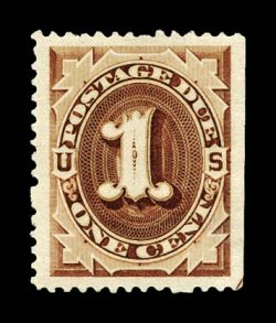 1349 nh J8 image#J8, 1c Deep brown special printing, a remarkable mint example of this extremely rare special printing, being from position 100L, with a natural straight edge at right which shows part of a plate arrow at bottom, fabulously bright and fresh, with strong rich color and a prooflike impression, both the hallmarks of the special printings, additionally this stamp possesses not only the finest centering and largest margins of any known copy, but also full unblemished original gum which has never been hinged, a feature not often found on the special printings as many lack gum altogether, faint corner crease at bottom right, otherwise extremely fine; despite the published issuance numbers, an extensive study of the Postage Due Special Printings by William E. Mooz has documented that these numbers are very much in error, he contends the vast majority of this value, believed to have been sold as special printings, were in fact the normal printings, furthermore of the small fraction that were indeed special printings, a large portion of those were destroyed, experience has confirmed his study as this particular value seldom comes to market and the prices realized under those rare occasions have established this as one of the rarest of the Postage Due Special Printings; 1974 PF certificate. (Image) for hinged $19,000.00