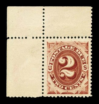 1350 nh J16 image#J16, 2c Red brown, a phenomenal top left corner sheet-margin mint single, in a quality unlike any other we have seen, possessing gigantic margins all around and being perfectly well centered within them, lovely rich color, immaculate o.g., n.h., superb; an amazing gem certain to realize a record price; ex-Floyd. (Image) for hinged $80.00