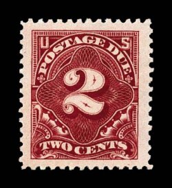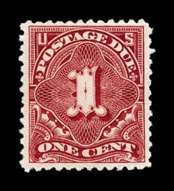 1380 og J58 image#J58, 50c Carmine lake, an especially crisp mint example of this, the rarest of all the regularly issued postage dues and one of the rarest stamps in United States philately, possessing a marvelous overall freshness not often encountered on most existing examples, with gorgeous vibrant color and a razor-sharp impression on bright paper, while centered just a bit to left, this is actually far better centered than many, as this stamp is notorious for being found poorly centered, often with its perforations cutting the design, full clean o.g., lightly hinged, fine; a stamp which makes infrequent appearances on the auction market; 1996 PF certificate. (Image) $15,000.00