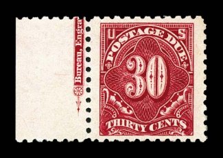 1369 nh J43 image#J43, 30c Deep claret, a brilliant "post office" fresh example, being one of the very few certified never hinged examples of this scarce postage due we have ever seen, let alone offer in our auctions, prooflike color and impression on bright crisp paper, quite well centered within large margins, immaculate o.g., n.h., very fine and exceedingly choice; 2004 PF certificate. (Image) $1,300.00