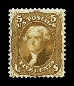 1042 og 67 image#67, 5c Buff, a seldom offered mint example of one of the most difficult of all 19th century United States stamps to find in any kind of collectible quality, being quite well centered and possessing exceptionally rich color, full clean o.g. which is an especially rare occurrence as most are found without gum, lightly hinged, accompanying certificate mentions tiny red markings in top and bottom margins which are virtually undetectable, although they fail to mention a reinforced corner perforation crease at top left, still very fine for this terribly rare mint stamp; 1970 PF certificate; ex-Neinken. (Image) $21,000.00