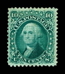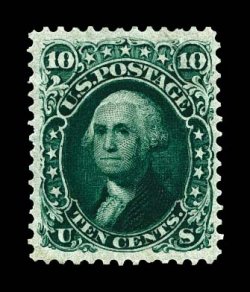 1043 og 68a image#68a, 10c Dark green, a brilliantly fresh mint example of this distinctive shade, featuring incredibly intense color and a razor-sharp impression on pristine paper, quite well centered and margined, full clean o.g., minor h.r., very fine; a scarce mint stamp with exceptional eye appeal; 1994 PF certificate. (Image) $1,200.00