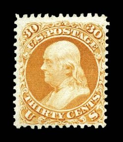 1046 og 71 image#71, 30c Orange, a brilliantly fresh mint example, featuring absolutely gorgeous intense color and a much stronger impression than usual, quite well centered and much larger margined than typically encountered, full o.g. that has been lightly hinged, a very fine and choice original gum Thirty Cent 1861 Issue, a terribly challenging stamp to find thus; 1998 PSE certificate. (Image) $2,000.00
