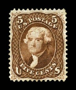 1050 og 75 image#75, 5c Red brown, a marvelously choice example of one of the rarest and most difficult of all 19th century stamps to find in premium condition, possessing rich and unmistakable red brown color, plus its impression is well incised on bright paper, exceptionally well centered within large margins, virtually full o.g., extremely fine; this stamp is almost never found with original gum, let alone in such outstanding condition; 1986 PF and 1989 PSE certificates. (Image) $5,000.00