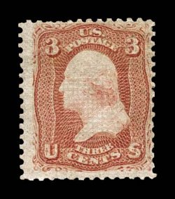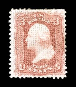 1054 og 85C image#85C, 3c Rose, "Z" grill, a sound original gum example of this immensely rare mint stamp, rather well centered with clear to large margins, particularly for a "Z" grill which is notorious for being found poorly centered, unusually strong rich color, full clean o.g. which shows the distinctive "Z" grill completely, relatively lightly hinged for this, very fine; an extremely rare mint stamp of which there is probably less than twenty in existence that are both sound and still possess full original gum; 1989 PSE certificate. (Image) $17,500.00