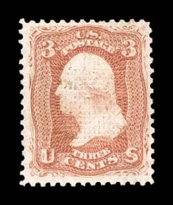 1051 og 79 image#79, 3c Rose, "A" grill, a very rare premium quality mint example of this notoriously difficult stamp, being among a select few existing examples that is both sound and still retaining its full original gum, wonderfully fresh, rich luxuriant color and a far stronger impression than usual on uncommonly bright paper, well centered, far more intact perforations than typically encountered, full clean o.g., lightly hinged, very fine and choice; the Scott catalog value quoted is for "fine-very fine copies with minor perf. faults"; 1983 and 1995 PF certificates; ex-McKinney. (Image) $7,500.00