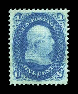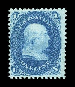 1060 og 92 image#92, 1c Blue, "F" grill, a gem mint example of this exceedingly difficult stamp to find in premium condition, possessing outstanding centering amid extravagantly large margins which are most uncharacteristic, fabulously bright and fresh, radiant color and a crisp impression on crisp paper, pristine full o.g., lightly hinged, extremely fine; a condition rarity, being one of the finest original gum 1867 One Cent "F" Grills available; 2000 PF certificate for a block of four, this being the bottom right stamp. (Image) $3,000.00
