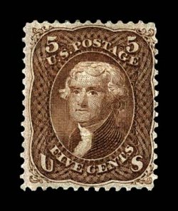 1062 og 95 image#95, 5c Brown, "F" grill, exceptionally fresh and choice mint example, with especially deep and luxuriant color, plus its impression is much stronger than usual, quite well centered within uncharacteristically large margins, full clean o.g. that has been relatively lightly hinged, very fine; a handsome original gum example of the Five Cent "F" Grill; 1993 PSE certificate. (Image) $3,500.00