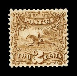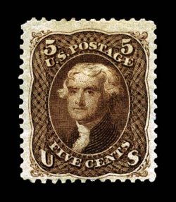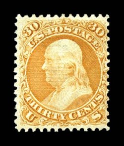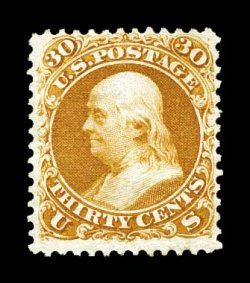 1075 og 110 image#110, 30c Brownish orange re-issue, a highly select mint example, possessing unusually strong and vivid characteristic re-issue color, plus its impression is exceptionally detailed on bright paper, wonderfully well centered with the perforations clearing the design all around, a rarely seen occurrence, full clean o.g., lightly hinged, very fine; a choice original gum Thirty Cent 1861 Re-issue, of which only 346 were issued; 1996 PF certificate. (Image) $6,500.00
