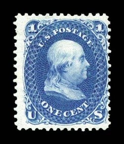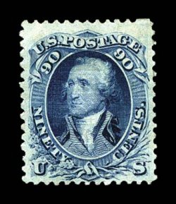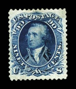 1066 og 101 image#101, 90c Blue, "F" grill, an extraordinarily rare offering of a mint example of this elusive and difficult stamp, being one of just a few certified original gum examples extant, possessing a marvelous overall freshness, with sumptuously rich color and an excellent clarity of impression on bright crisp paper, quite well centered within large margins, especially clean full o.g. which shows the grill impression superbly, lightly hinged, very fine and exceedingly choice; an enormously rare mint stamp that is missing in virtually every mint collection, no matter how comprehensive, for example even the impressive collections formed by Messrs. Weisman, Zoellner, Lyons, Floyd and Lessin did not have a single example of an original gum Ninety Cent "F" Grill; 1999 PF certificate; ex-McKinney. (Image) $13,000.00