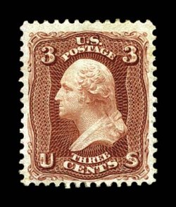 1069 og 104 image#104, 3c Brown red re-issue, marvelously fresh and crisp mint example, featuring deep prooflike color and impression on bright paper, well centered within large margins, full o.g., relatively lightly hinged, very fine; a select example of this rarity of which only 465 were issued; 1990 PF certificate. (Image) $4,000.00