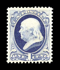 1132 nh 182 image#182, 1c Dark ultramarine, gem mint example, being in a condition that would please the perfectionist, possessing precise centering amid large margins, incredibly bright and crisp, rich color and a strong impression on immaculate paper, pristine o.g., never hinged, extremely fine; a terribly challenging stamp to find never hinged, particularly in this premium condition; 2000 PF certificate for a vertical pair, this being the top stamp. (Image) for hinged $350.00