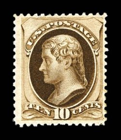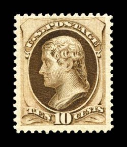 1138 og 188 image#188, 10c Brown, with secret mark, handsome mint example of a stamp that is seldom found even in the most advanced collections of mint United States stamps, featuring sumptuously rich color and a sharp detailed impression, plus it is quite well centered within large margins, particularly clean o.g., lightly hinged, very fine and exceedingly choice; actually a very rare stamp in this premium original gum condition; 2002 PF certificate. (Image) $2,500.00