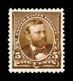 1165 nh 223 image#223, 5c Chocolate, outstanding centering amid lavishly large margins which are seldom seen on this value, gorgeous luxuriant color and a prooflike impression which are wonderfully contrasted by its bright white paper, pristine o.g., n.h., extremely fine gem; 1991 PF certificate; ex-Floyd. (Image) $250.00