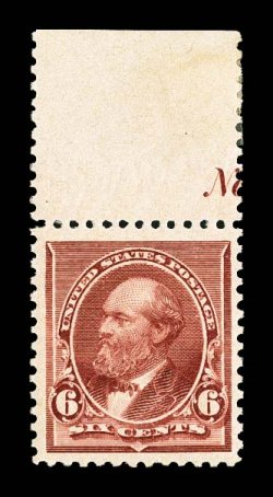 1166 nh 224 image#224, 6c Brown red, handsome top sheet-margin partial imprint single, boasting uncharacteristically large margins and being wonderfully well centered within them, bright color and a crisp detailed impression, unblemised o.g. without a single gum bend or skip, n.h. (hinged in top sheet selvage only), extremely fine; 1996 PF certificate. (Image) $225.00