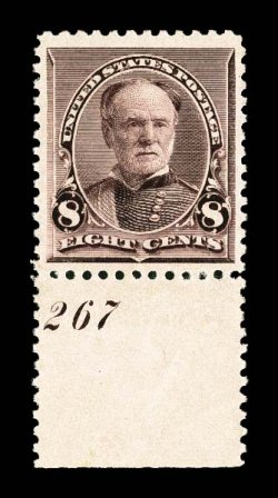 1167 nh 225 image#225, 8c Lilac, choice bottom sheet-margin plate no. 267 single, exceptionally well centered within large margins, rich color and a sharp impression on bright paper, o.g., n.h., extremely fine. (Image) $175.00