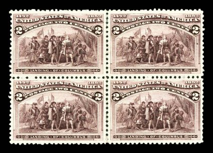 1172 og/nhbl 231 var. image#231 var., 2c Columbian, "broken hat" variety, seldom seen mint block of four with each stamp being the "broken hat" variety, quite fresh, rich color, well centered throughout, o.g., three stamps n.h., top right stamp faintly hinged (and also has trivial inclusion speck), choice very fine. (Image) as singles $515.00+