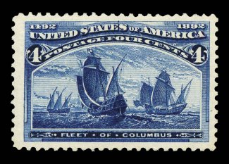 1173 og 233a image#233a, 4c Blue Columbian, error of color, a phenomenal mint example of this high profile rarity, possessing an overall freshness and crispness unlike any other, with sensationally rich and true error color, plus its impression is extraordinarily detailed on bright clean paper, and most impressive of all is this stamp's spectacular centering amid the most immense margins of any existing example, full clean o.g., lightly hinged, extremely fine.The Four Cent Columbian color error exists in two different shades, one being far more deep, having come from at least two different sheets. The example offered here possesses the most intense rich shade of any we have ever seen.An exciting opportunity to acquire what has long been considered one of the very finest Four Cent Columbian color errors in existence. The last appearance at auction of this incomparable stamp was in our March 2002 "Premier Sale" where it realized $29,700.00. Since that time no comparable #233a has appeared on the auction block. Accompanied by a 1951 PF certificate; ex-Hetherington, Anderson and Higgins. (Image) $18,500.00