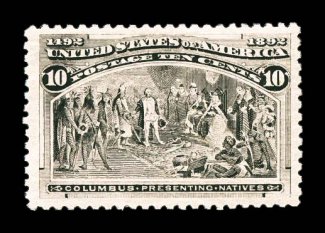 1174 nh 237 image#237, 10c Columbian, incredibly well centered amid extravagantly large margins which are most uncharacteristic of this value, crisp prooflike color and impression, o.g., n.h., some natural paper wrinkles/bends not mentioned on accompanying certificate, extremely fine; clear 1999 APS certificate. (Image) $325.00