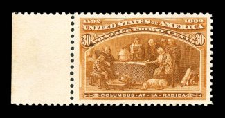 1175 nh 239 image#239, 30c Columbian, left sheet-margin single, flawlessly centered amid lavishly large margins, gloriously rich color and a deeply etched impression, pristine o.g., never hinged, small natural inclusion not mentioned on accompanying certificate, extremely fine; a striking stamp; photocopy of a 1991 PF certificate for a block of four, this being the bottom left stamp. (Image) $750.00