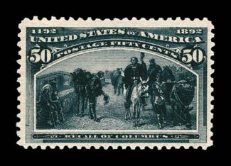 1176 nh 240 image#240, 50c Columbian, an eye-arresting mint example, with a fabulous overall freshness very few other Fifty Cent Columbians possess, featuring incredibly intense color and a deeply incised impression on uncommonly bright paper (not toned as often seen on this stamp), crisp intact perforations all around, wonderfully well centered within large margins, pristine o.g., never hinged, certainly extremely fine considering this stamp's exceptional overall qualities; this is the most elusive of all the non-dollar value Columbians to find never hinged; 1990 PF certificate; ex-Billington. (Image) $1,700.00