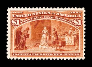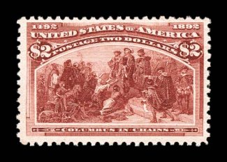 1178 nh 242 image#242, $2.00 Columbian, a most remarkable mint example, with color and paper as fresh as the day it was issued, gloriously rich color and a prooflike impression on bright white paper, crisp intact perforations all around, particularly well centered within large margins, immaculate o.g. in the freshest state of preservation imaginable, never hinged, a very fine and incredibly choice never hinged Two Dollar Columbian, one of the rarest of all the commemorative issues to find both never hinged and in premium condition; 2000 PF certificate. (Image) $3,650.00
