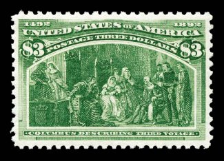 1179 nh 243 image#243, $3.00 Columbian, a fabulous mint example in not only premium condition, but in the freshest state of preservation imaginable, possessing an overall brilliance and freshness that must be seen in person to fully appreciate, with spectacularly rich and vibrant color, plus a deeply etched impression on the most immaculately white paper we have ever seen on this value, its centering is near perfection amid very large margins, and especially even and intact perforations surround the whole, the reverse boasts pristine o.g. that has never been hinged, an extremely fine gem in every regard; unquestionably one of the finest never hinged Three Dollar Columbians in existence; an essential stamp for the collector who is tackling the incredibly challenging task of assembling a gem never hinged set of Columbians; 1997 PF certificate for a block of four, this being the bottom right stamp; ex-Lyons. (Image) $5,750.00