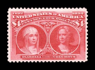 1180 nh 244 image#244, $4.00 Columbian, a most remarkable mint single, possessing a fabulous overall freshness that is seldom encountered on this value, with gorgeous vibrant color and a deeply etched impression on pristine paper, quite well centered within large margins, unblemished o.g., never hinged, a very fine and exceedingly choice never hinged example of the Four Dollar Columbian; all of the dollar value Columbians have always been terribly elusive to find in a true "post office" state of preservation - namely never hinged, the example offered here is not only boasts this feature but also is the beneficiary of great color, impression and centering; 2000 PF certificate. (Image) $8,000.00