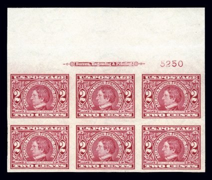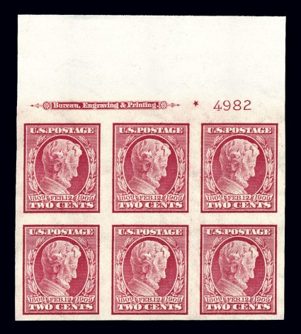 41 nhPB 368 image#368, 2c Lincoln, imperforate, full top margin imprint, small solid star and plate no. 4982 block of six, exceptionally well margined, deep rich color, o.g., n.h., extremely fine; a select full top plate block. (Image) $275.00