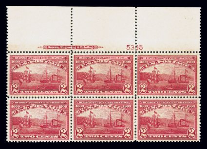 44 nhPB 372 image#372, 2c Hudson-Fulton, a most remarkable quality full top margin imprint and plate no. 5395 block of six, possessing the finest centering we have ever encountered on this plate block, with each stamp boasting unusually large and well balanced margins, deep rich color, strong and fully intact perforations, unblemished o.g., n.h., extremely fine; while not a rare plate block, it can be considered so in this irreplaceable gem condition. (Image) $425.00