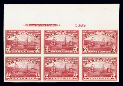 45 nhPB 373 image#373, 2c Hudson-Fulton imperforate, full top margin imprint and plate no. 5389 block of six, uniformly large margins, strong rich color, o.g., n.h., extremely fine. (Image) $375.00
