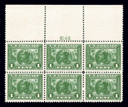46 nhPB 397 image#397, 1c Panama-Pacific, striking full top margin plate no. 6148 block of six, boasting several eye-arresting physical qualities, including an extra-wide sheet selvage, plus each stamp within the plate could not be more perfectly centered amid very large margins, prooflike color and impression, o.g., n.h., top left stamp with small natural gum skip, bottom center stamp with perf. disc dimple, extremely fine; an incredibly attractive and choice plate block. (Image) $325.00